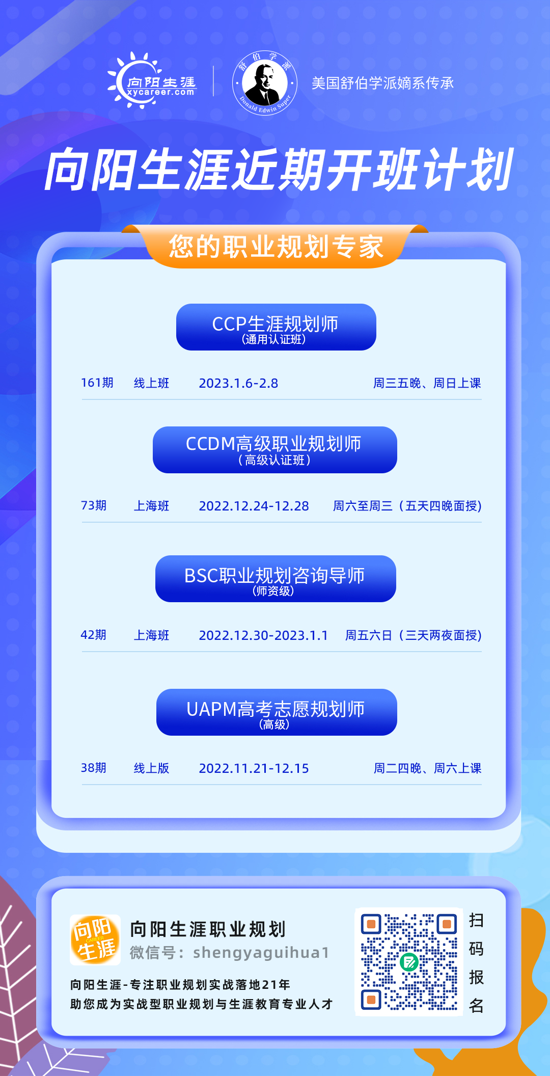 CCDM高级职业规划师是国内首个标准化职业规划师认证培训体系,是国际职业规划大师舒伯学派在我国的落地系统,专门培养职业规划、生涯教育和职业咨询领域的专家型人才。