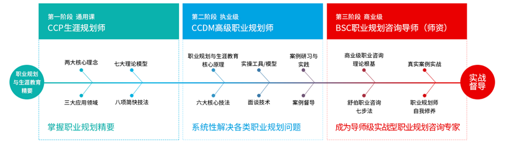 也就是说,要成为职业规划师,不仅要有专业知识的学习,更强调技能的实践训练,远非几天的课程就达成的,需要分几个阶段学习训练。